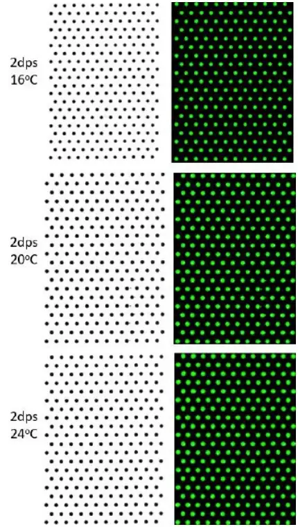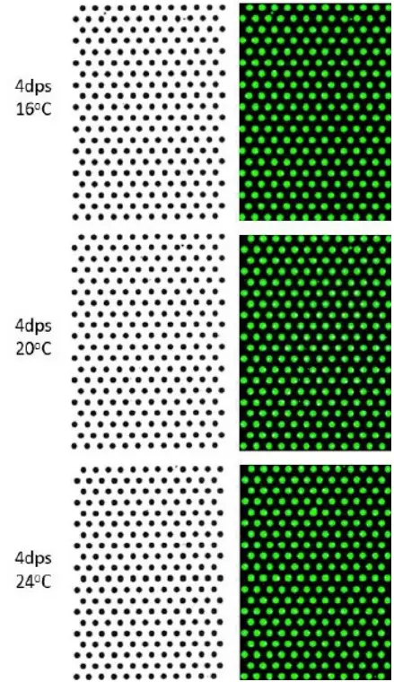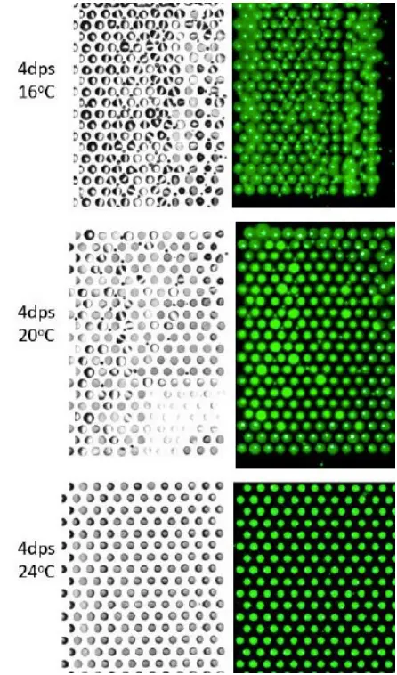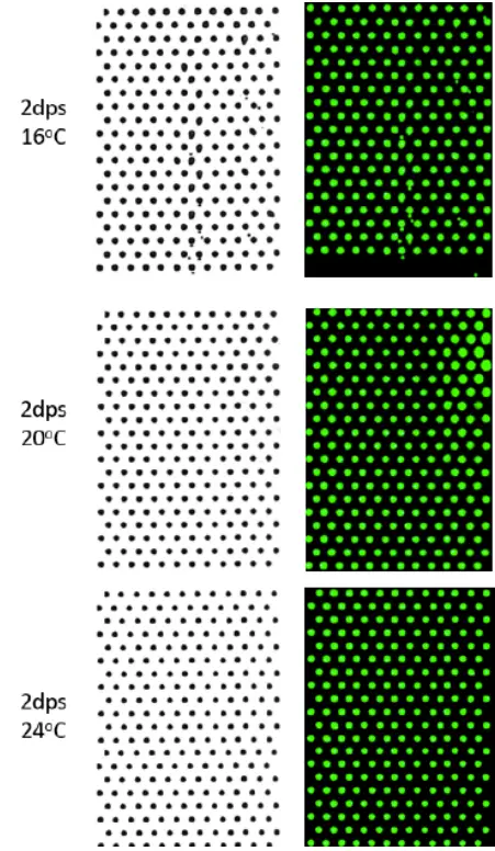 Post-print images confirmed 100% of spots printed on all slides and with excellent morphology – particularly at the higher temperature of 24 °C. There were no artefacts or signs of dust contamination on the printed slides.