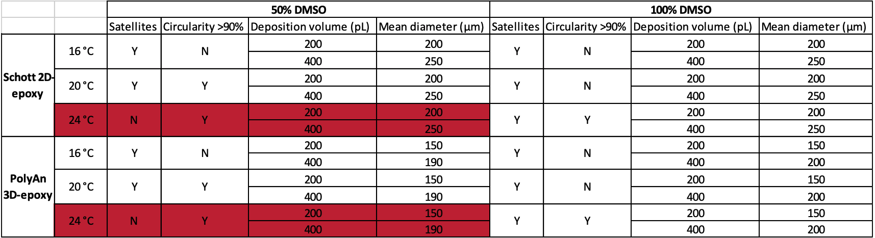 The best quality printing was achieved with 50% DMSO printed at 24 °C. Both deposition volumes printed with excellent morphology on both slides. Printing with 100% DMSO was most consistent, and with fewest satellite spots at 24 °C and with a printing deposition volume of 200 pL.