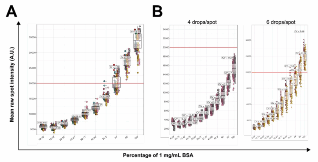 Another critical point is the time required to print a defined number of slides. Contact pin printing is very demanding in terms of time when the number of slides to be printed is increased, ultimately leading to sample evaporation issues. Given a comparable number of RPPA samples and slides, using the Arrayjet inkjet printer significantly reduced printing times and sample evaporation, ultimately leading to improved consistency in the printed slides. A real-world example of printing 550 RPPA samples on 210 slides using the Aushon 2470 arrayer takes a full week of consecutive printing, with samples sitting in the microplates for up to three days per slide half. Filling a comparable portion of the nitrocellulose slide with twice the RPPA samples using the Arrayjet Marathon would take about 24 h at 600 pL/spot.